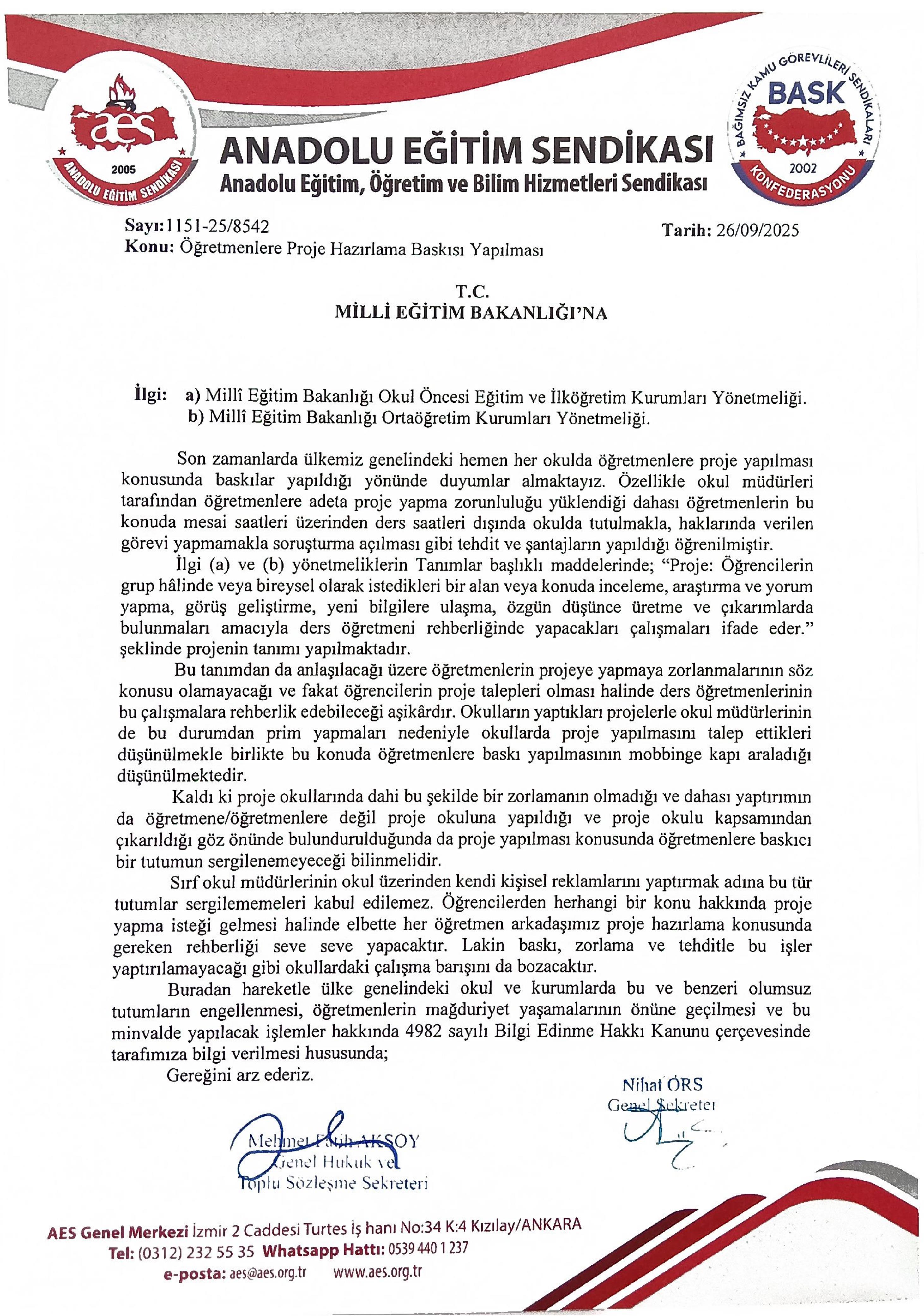 Son zamanlarda ülkemiz genelindeki hemen her okulda öğretmenlere proje yapılması konusunda baskılar yapıldığı yönünde duyumlar almaktayız. Özellikle okul müdürleri tarafından öğretmenlere adeta proje yapma zorunluluğu yüklendiği dahası öğretmenlerin bu konuda mesai saatleri üzerinden ders saatleri dışında okulda tutulmakla, haklarında verilen görevi yapmamakla soruşturma açılması gibi tehdit ve şantajların yapıldığı öğrenilmiştir. Öğretmenlerin projeye yapmaya zorlanmalarının söz konusu olamayacağı ve fakat öğrencilerin proje talepleri olması halinde ders öğretmenlerinin bu çalışmalara rehberlik edebileceği aşikârdır. Okulların yaptıkları projelerle okul müdürlerinin de bu durumdan prim yapmaları nedeniyle okullarda proje yapılmasını talep ettikleri düşünülmekle birlikte bu konuda öğretmenlere baskı yapılmasının mobbinge kapı araladığı düşünülmektedir.