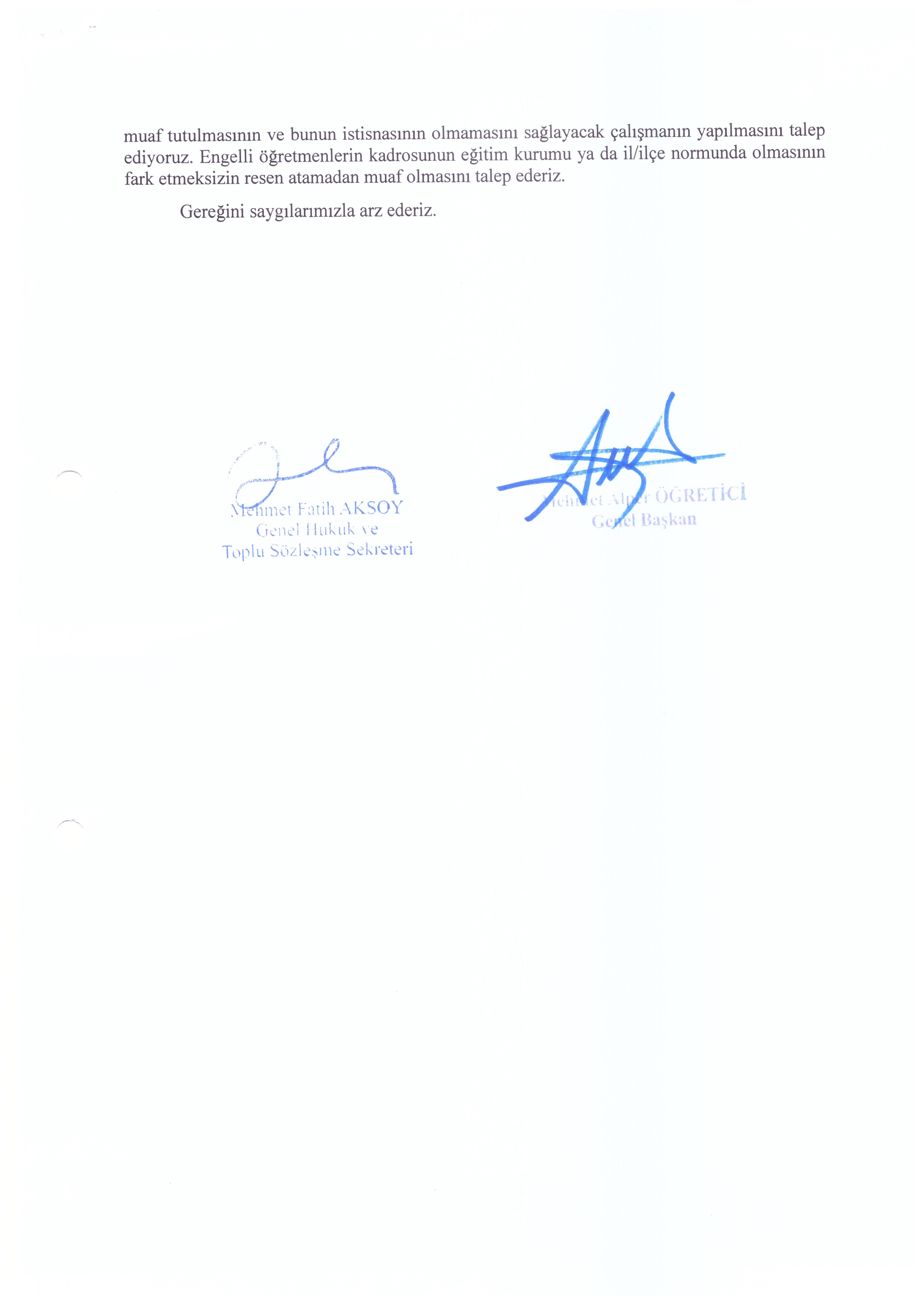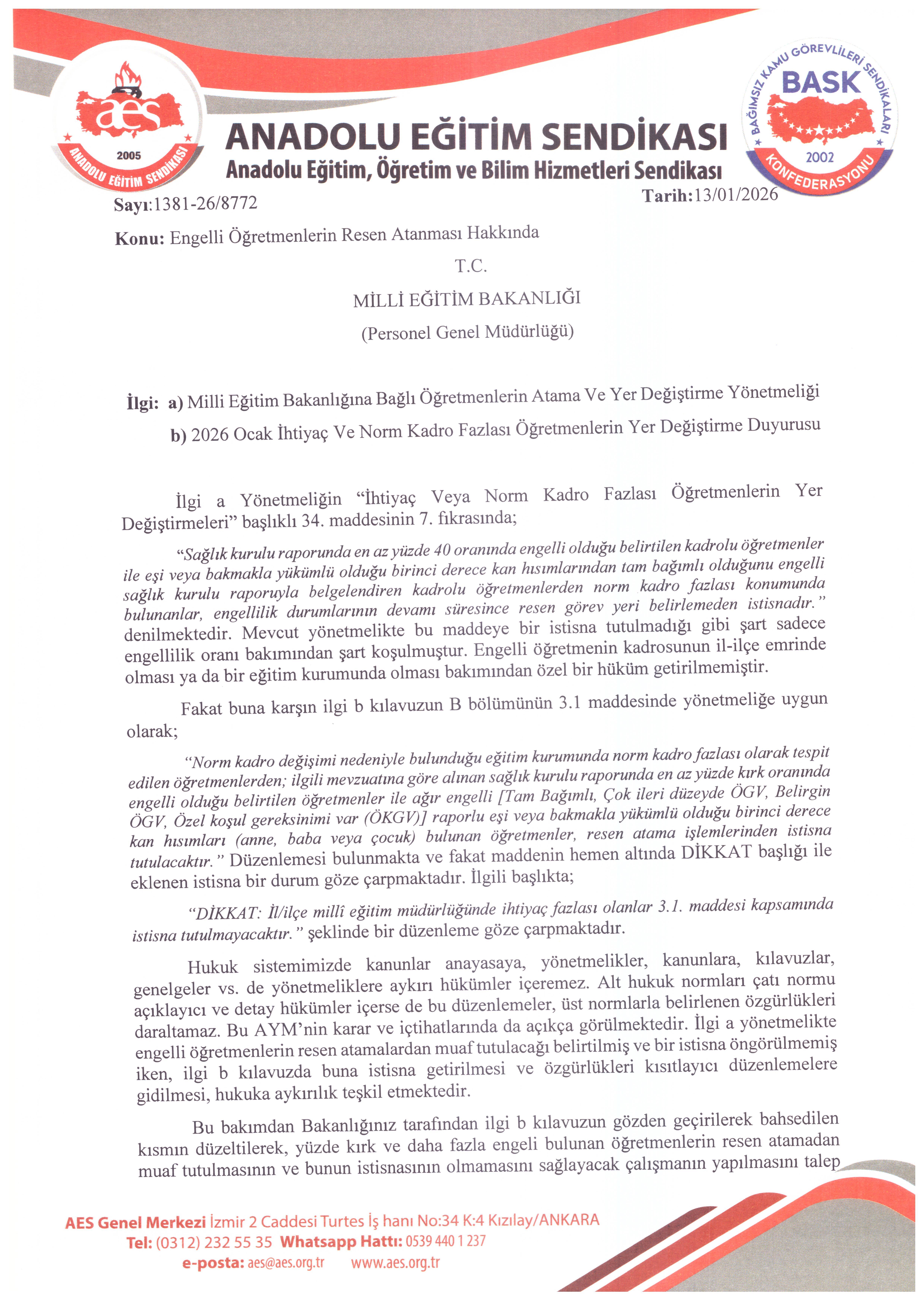 “Sağlık kurulu raporunda en az yüzde 40 oranında engelli olduğu belirtilen kadrolu öğretmenler ile eşi veya bakmakla yükümlü olduğu birinci derece kan hısımlarından tam bağımlı olduğunu engelli sağlık kurulu raporuyla belgelendiren kadrolu öğretmenlerden norm kadro fazlası konumunda bulunanlar, engellilik durumlarının devamı süresince resen görev yeri belirlemeden istisnadır.” denilmektedir. Fakat “2026 Ocak İhtiyaç Ve Norm Kadro Fazlası Öğretmenlerin Yer Değiştirme Duyurusu” na bakıldığında bu yönetmelik hükmüne aykırı olacak şekilde bir istitsna tutulmuştur. Buna göre il/ilçe de bulunan norm fazlası öğretmenler bu maddeden yararlanamayacak ve resen ataması yapılabilecektir. Oysa engel durumu şartları sağlayan bu öğretmenlerin de resen atamadan muaf tutulması gerekmekte, aksi uygulamanın öğretmenleri mağdur edeceği gerçeği görülmelidir.