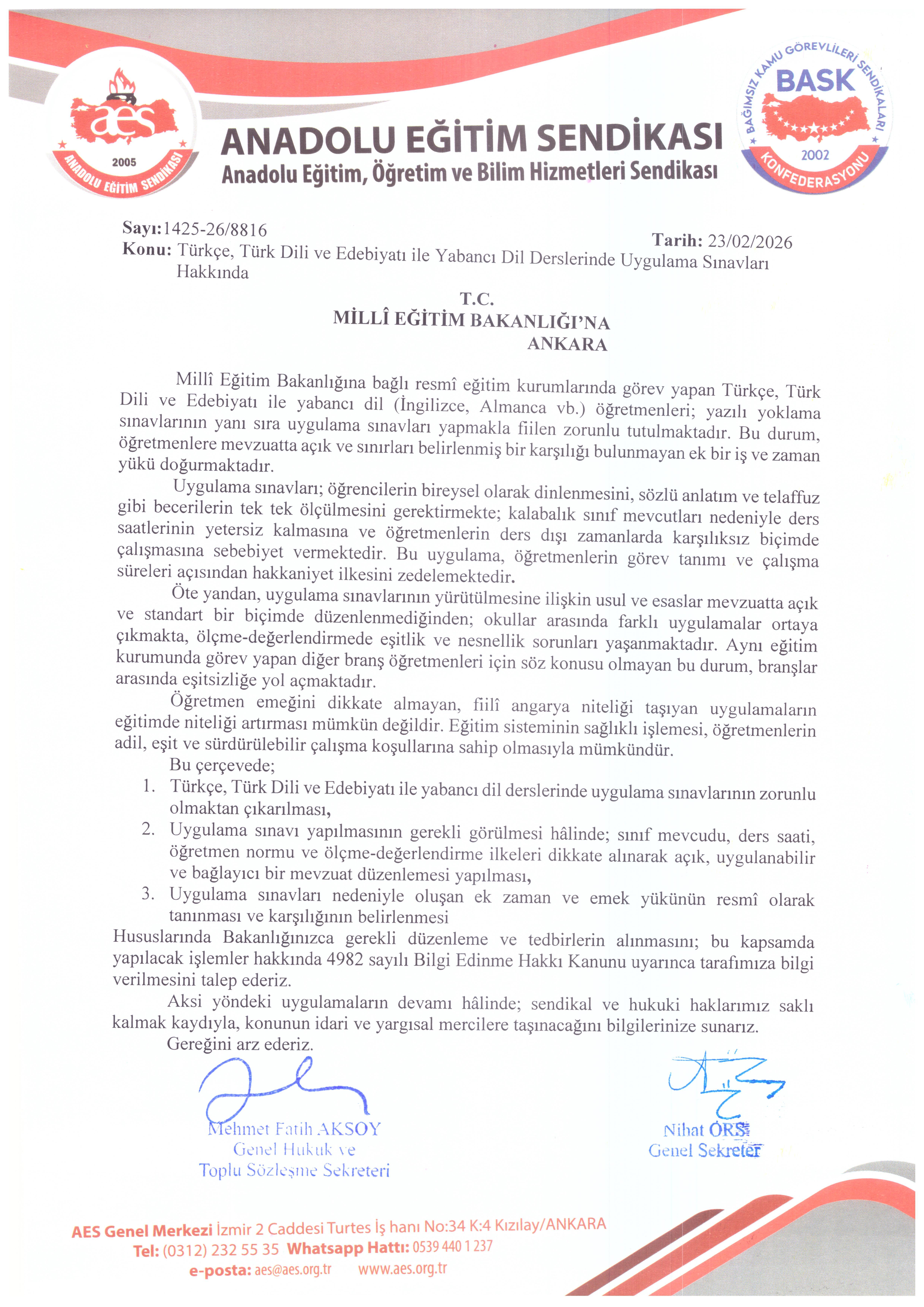 Anadolu Eğitim Sendikası olarak; Türkçe, Türk Dili ve Edebiyatı ile yabancı dil derslerinde zorunlu tutulan uygulama sınavlarına ilişkin taleplerimizi Millî Eğitim Bakanlığına resmî dilekçeyle ilettik.